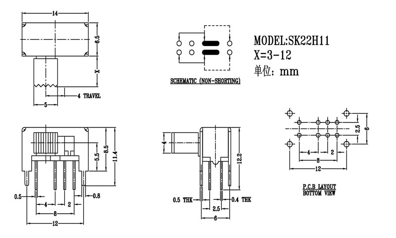 使用功率/額定值Rating:DC 50V 0.3A~1A 觸點電阻/Contact Resistance:< 100 mΩ 絕緣電阻/Insulation Resistance:≥ 100 MΩ 耐壓/Withstand Voltage:500V AC for 1 minute 使用壽命/Life cycles:10000次 操作溫度/Operationg Temperature:-16℃to+60℃ 儲存溫度/Storage Temperature:-40℃to+85℃ 符合標準/Complies with:RoHs&Reach