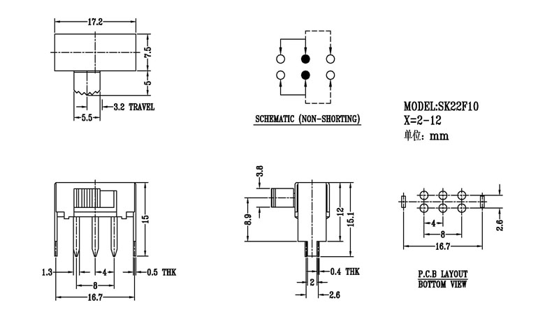 Slide Switch Main data Rating:DC 50V 0.3A~1A ContactResistance:< 100 mΩ InsulationResistance:≥ 100 MΩ Withstand Voltage:500V AC for 1 minute Operating Force:180~500gf Life cycles:10000次 Operationg Temperature:-16℃to+60℃ Storage Temperature:-40℃to+85℃ Complies with:RoHs&Reach