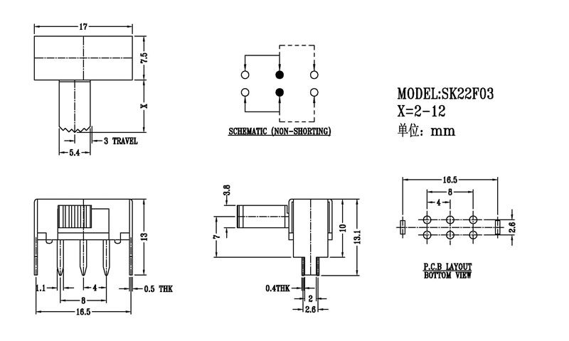 Slide Switch Main data Rating:DC 50V 0.3A~1A ContactResistance:< 100 mΩ InsulationResistance:≥ 100 MΩ Withstand Voltage:500V AC for 1 minute Operating Force:180~500gf Life cycles:10000次 Operationg Temperature:-16℃to+60℃ Storage Temperature:-40℃to+85℃ Complies with:RoHs&Reach