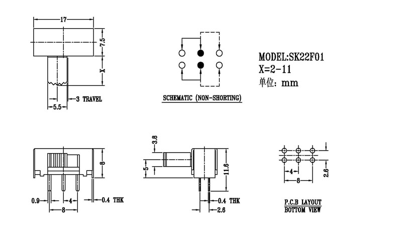Slide Switch Main data Rating:DC 50V 0.3A~1A ContactResistance:< 100 mΩ InsulationResistance:≥ 100 MΩ Withstand Voltage:500V AC for 1 minute Operating Force:180~500gf Life cycles:10000次 Operationg Temperature:-16℃to+60℃ Storage Temperature:-40℃to+85℃ Complies with:RoHs&Reach
