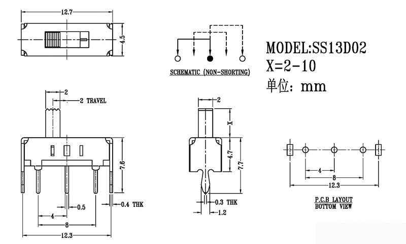 Slide Switch Main data Rating:DC 50V 0.3A~1A ContactResistance:< 100 mΩ InsulationResistance:≥ 100 MΩ Withstand Voltage:500V AC for 1 minute Operating Force:180~500gf Life cycles:10000次 Operationg Temperature:-16℃to+60℃ Storage Temperature:-40℃to+85℃ Complies with:RoHs&Reach