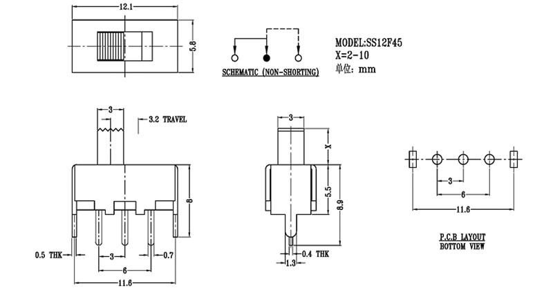 Slide Switch Main data Rating:DC 50V 0.3A~1A ContactResistance:< 100 mΩ InsulationResistance:≥ 100 MΩ Withstand Voltage:500V AC for 1 minute Operating Force:180~500gf Life cycles:10000次 Operationg Temperature:-16℃to+60℃ Storage Temperature:-40℃to+85℃ Complies with:RoHs&Reach