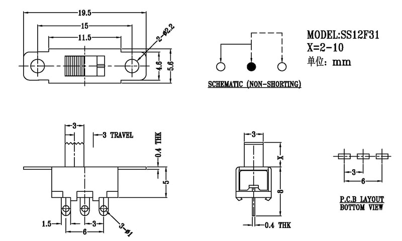 Slide Switch Main data Rating:DC 50V 0.3A~1A ContactResistance:< 100 mΩ InsulationResistance:≥ 100 MΩ Withstand Voltage:500V AC for 1 minute Operating Force:180~500gf Life cycles:10000次 Operationg Temperature:-16℃to+60℃ Storage Temperature:-40℃to+85℃ Complies with:RoHs&Reach