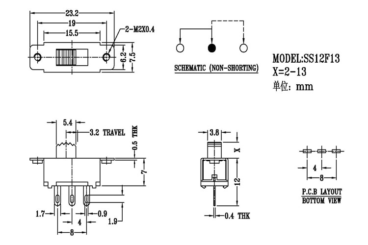 Slide Switch Main data Rating:DC 50V 0.3A~1A ContactResistance:< 100 mΩ InsulationResistance:≥ 100 MΩ Withstand Voltage:500V AC for 1 minute Operating Force:180~500gf Life cycles:10000次 Operationg Temperature:-16℃to+60℃ Storage Temperature:-40℃to+85℃ Complies with:RoHs&Reach