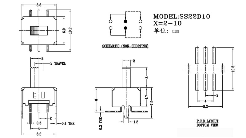 Slide Switch Main data Rating:DC 50V 0.3A~1A ContactResistance:< 100 mΩ InsulationResistance:≥ 100 MΩ Withstand Voltage:500V AC for 1 minute Operating Force:180~500gf Life cycles:10000次 Operationg Temperature:-16℃to+60℃ Storage Temperature:-40℃to+85℃ Complies with:RoHs&Reach