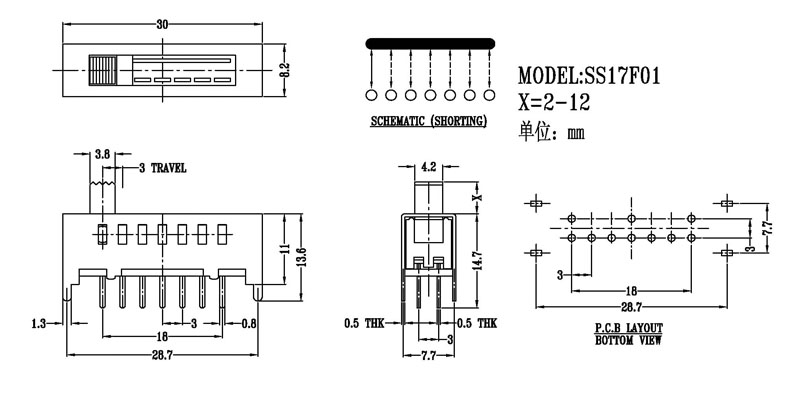 Slide Switch Main data Rating:DC 50V 0.3A~1A ContactResistance:< 100 mΩ InsulationResistance:≥ 100 MΩ Withstand Voltage:500V AC for 1 minute Operating Force:180~500gf Life cycles:10000次 Operationg Temperature:-16℃to+60℃ Storage Temperature:-40℃to+85℃ Complies with:RoHs&Reach