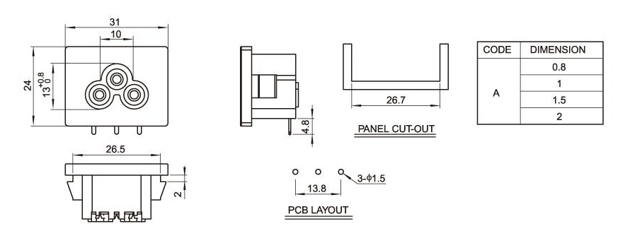 Standard: IEC 60320 C6 Rating: 2.5A 250V AC Insulation Resistance: 100MΩ 500V DC/1 minute Dielectric Strength: 2000V AC/1 minute Housing Material: Thermoplastic 94V-2~V-0