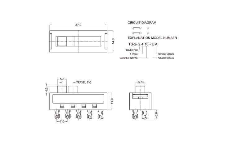 工作溫度范圍Operating temperature range:-30℃ to+85℃ 額定電流Rating:3A 250V AC 絕緣電阻Insulation resistance: 100MΩ min.500V DC 接觸電阻Contact resistance: 30m Ω max. 操作力度Operating fore:250±100gf 壽命Life time:10000 cycles(依產(chǎn)品而定)