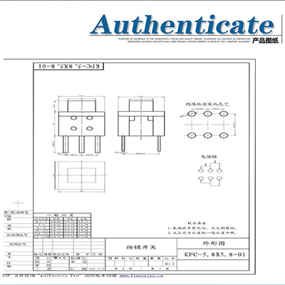 產品型號:KFC-5.8X5.8-01 / 腳位:直插6腳 / 產品壽命:50000次 / 額定負荷:30V 0.5A / 絕緣電阻:≥100MΩ / 接觸電阻:≤30Ω / 環境溫度:-40~70℃
