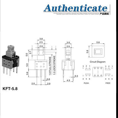 產(chǎn)品型號(hào):KFT-5.8 / 腳位:直插6腳 / 產(chǎn)品壽命:50000次 / 額定負(fù)荷:30V 0.5A / 絕緣電阻:≥100MΩ / 接觸電阻:≤30Ω / 環(huán)境溫度:-40~70℃