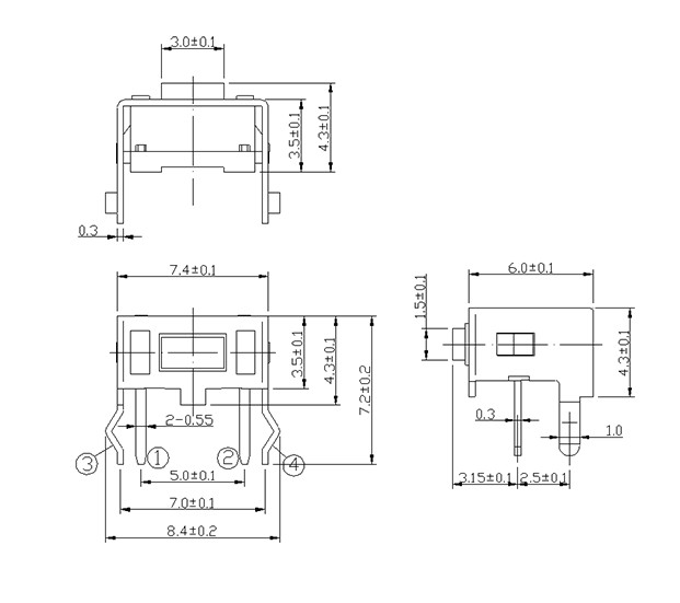 尺寸: 7.3X6mm 產品分類: 輕觸開關 - B系列 / 3x6一型二型 應用 ※ 各種便攜式電子設備 ※ 用于操作各種緊湊的像手機,通訊設備這種需要高安裝密度的電子設備 ※ 用于操作各種MP4 MP3 特點 ※ 側邊類型可以在PCB上側按 ※ 回流可焊