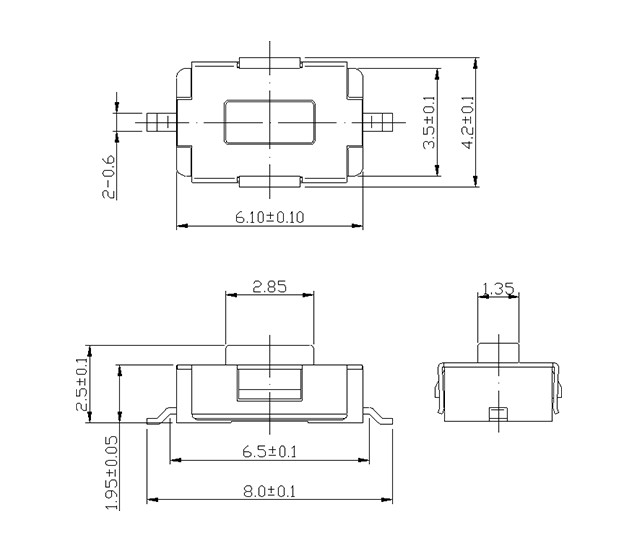 尺寸: 6.1X3.5mm 產品分類: 輕觸開關 - B系列 / 3x6一型二型 應用 ※ 用于各種電子設備操作 ※ 音頻設備,辦公設備,通訊設備 ※ 測量儀器,電視機,電視錄像機等 特點 ※ 高可靠的觸點封裝結構 ※ 大的按鈕表面提高安裝速度 ※ 回流可焊