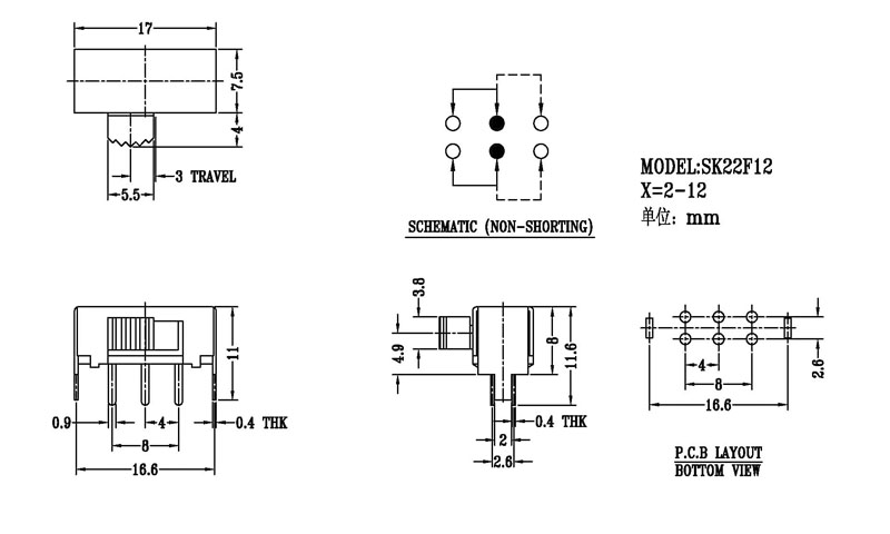 撥動開關主要技術參數: 使用功率/額定值:DC 50V 0.3A~1A 觸點電阻:< 100 mΩ 絕緣電阻:≥ 100 MΩ 耐壓:500V AC for 1 minute 撥動力:180~500gf 使用壽命:10000次 操作溫度:-16℃to+60℃ 儲存溫度:-40℃to+85℃ 符合標準:RoHs&Reach
