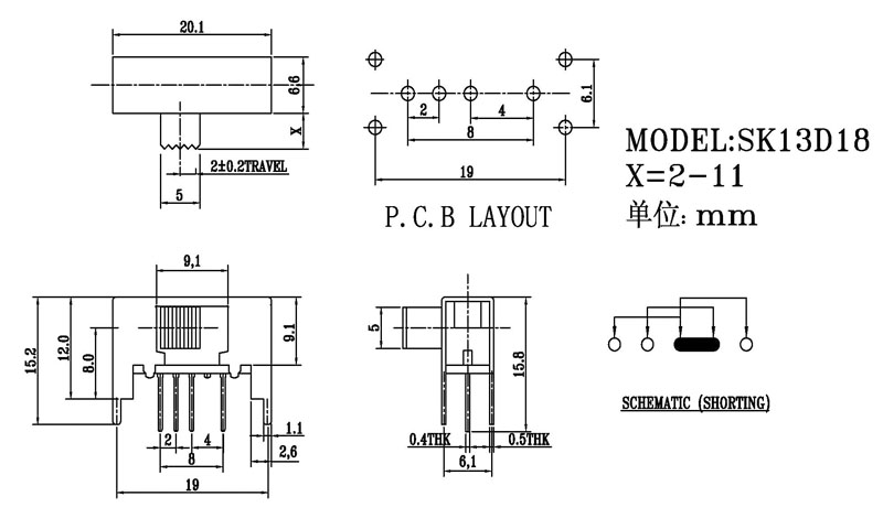 撥動開關主要技術參數: 使用功率/額定值:DC 50V 0.3A~1A 觸點電阻:< 100 mΩ 絕緣電阻:≥ 100 MΩ 耐壓:500V AC for 1 minute 撥動力:180~500gf 使用壽命:10000次 操作溫度:-16℃to+60℃ 儲存溫度:-40℃to+85℃ 符合標準:RoHs&Reach