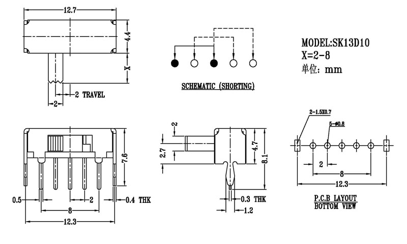 撥動開關主要技術參數: 使用功率/額定值:DC 50V 0.3A~1A 觸點電阻:< 100 mΩ 絕緣電阻:≥ 100 MΩ 耐壓:500V AC for 1 minute 撥動力:180~500gf 使用壽命:10000次 操作溫度:-16℃to+60℃ 儲存溫度:-40℃to+85℃ 符合標準:RoHs&Reach