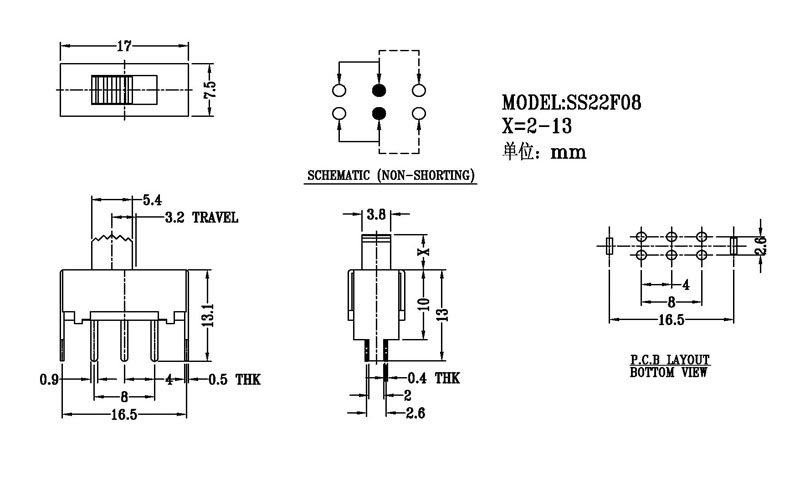 撥動開關主要技術參數: 使用功率/額定值:DC 50V 0.3A~1A 觸點電阻:< 100 mΩ 絕緣電阻:≥ 100 MΩ 耐壓:500V AC for 1 minute 撥動力:180~500gf 使用壽命:10000次 操作溫度:-16℃to+60℃ 儲存溫度:-40℃to+85℃ 符合標準:RoHs&Reach