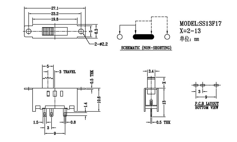 正撥撥動(dòng)開(kāi)關(guān)主要技術(shù)參數(shù) 使用功率/額定值:DC 50V 0.3A~1A 觸點(diǎn)電阻:< 100 mΩ 絕緣電阻:≥ 100 MΩ 耐壓:500V AC for 1 minute 撥動(dòng)力:180~500gf 使用壽命:10000次 操作溫度:-16℃to+60℃ 儲(chǔ)存溫度:-40℃to+85℃ 符合標(biāo)準(zhǔn):RoHs&Reach