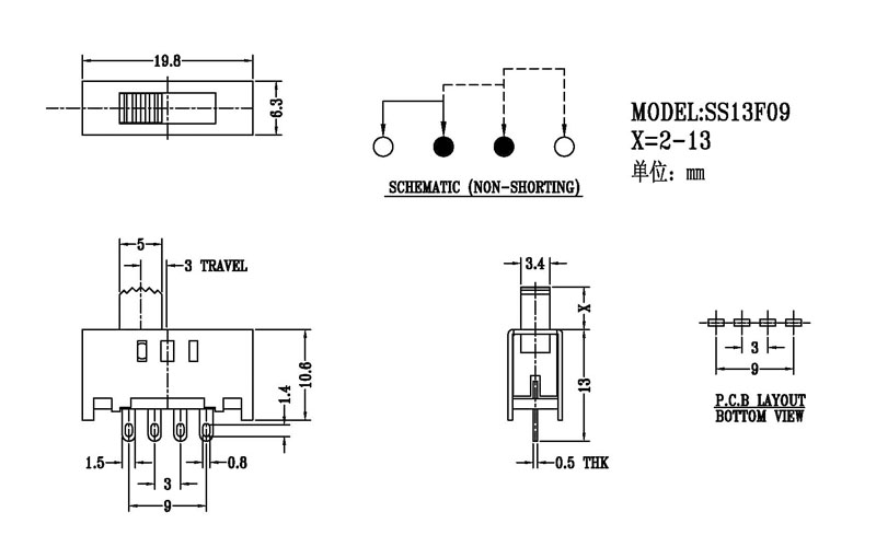 正撥撥動開關主要技術參數 使用功率/額定值:DC 50V 0.3A~1A 觸點電阻:< 100 mΩ 絕緣電阻:≥ 100 MΩ 耐壓:500V AC for 1 minute 撥動力:180~500gf 使用壽命:10000次 操作溫度:-16℃to+60℃ 儲存溫度:-40℃to+85℃ 符合標準:RoHs&Reach