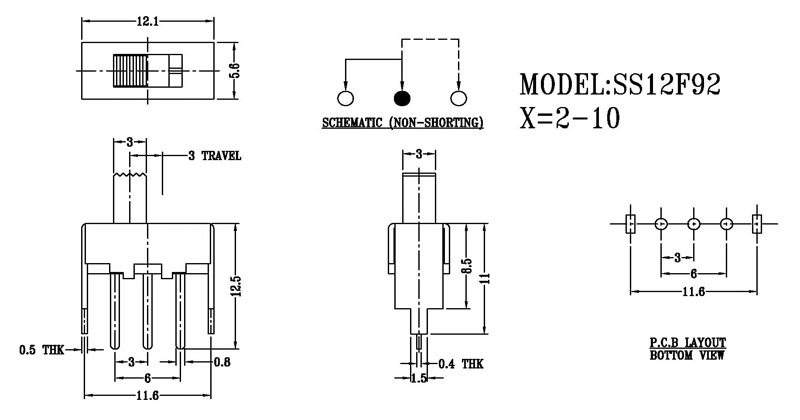 正撥撥動開關主要技術參數 使用功率/額定值:DC 50V 0.3A~1A 觸點電阻:< 100 mΩ 絕緣電阻:≥ 100 MΩ 耐壓:500V AC for 1 minute 撥動力:180~500gf 使用壽命:10000次 操作溫度:-16℃to+60℃ 儲存溫度:-40℃to+85℃ 符合標準:RoHs&Reach
