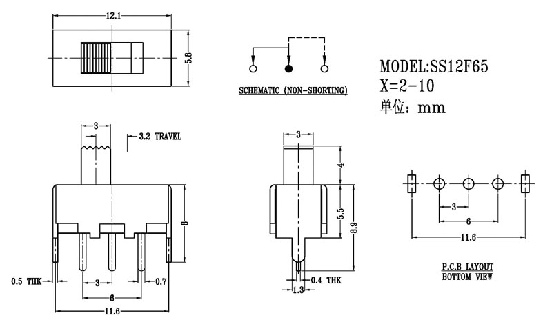 正撥撥動開關主要技術參數 使用功率/額定值:DC 50V 0.3A~1A 觸點電阻:< 100 mΩ 絕緣電阻:≥ 100 MΩ 耐壓:500V AC for 1 minute 撥動力:180~500gf 使用壽命:10000次 操作溫度:-16℃to+60℃ 儲存溫度:-40℃to+85℃ 符合標準:RoHs&Reach