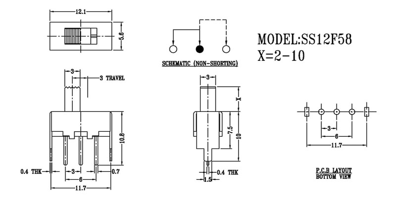 正撥撥動開關主要技術參數 使用功率/額定值:DC 50V 0.3A~1A 觸點電阻:< 100 mΩ 絕緣電阻:≥ 100 MΩ 耐壓:500V AC for 1 minute 撥動力:180~500gf 使用壽命:10000次 操作溫度:-16℃to+60℃ 儲存溫度:-40℃to+85℃ 符合標準:RoHs&Reach