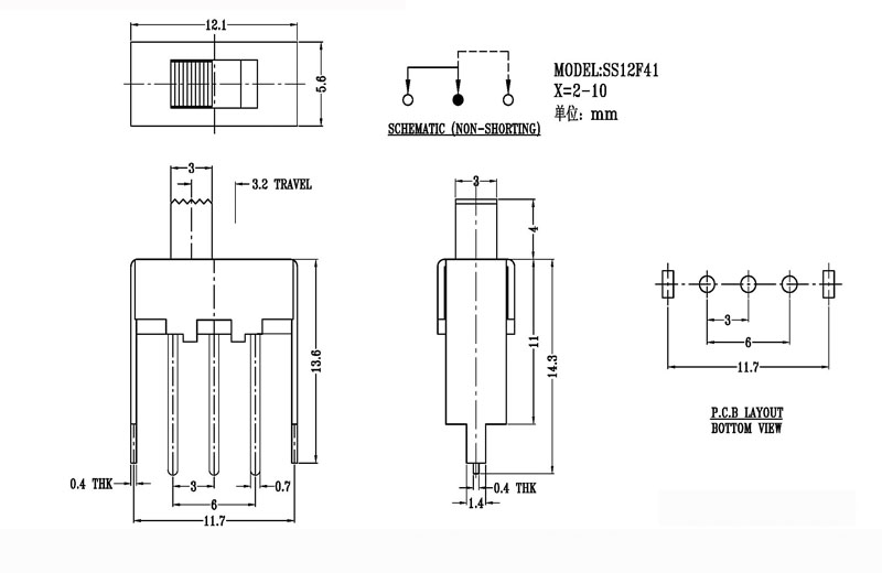 正撥撥動開關主要技術參數 使用功率/額定值:DC 50V 0.3A~1A 觸點電阻:< 100 mΩ 絕緣電阻:≥ 100 MΩ 耐壓:500V AC for 1 minute 撥動力:180~500gf 使用壽命:10000次 操作溫度:-16℃to+60℃ 儲存溫度:-40℃to+85℃ 符合標準:RoHs&Reach