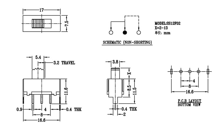 正撥撥動開關主要技術參數 使用功率/額定值:DC 50V 0.3A~1A 觸點電阻:< 100 mΩ 絕緣電阻:≥ 100 MΩ 耐壓:500V AC for 1 minute 撥動力:180~500gf 使用壽命:10000次 操作溫度:-16℃to+60℃ 儲存溫度:-40℃to+85℃ 符合標準:RoHs&Reach