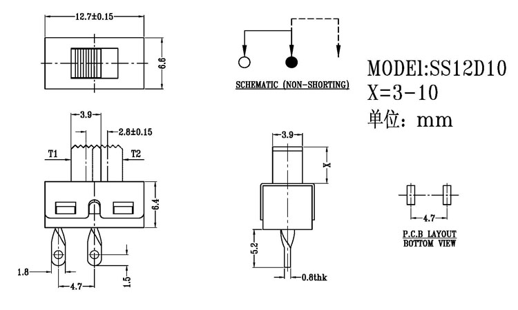 正撥撥動開關主要技術參數 使用功率/額定值:DC 50V 0.3A~1A 觸點電阻:< 100 mΩ 絕緣電阻:≥ 100 MΩ 耐壓:500V AC for 1 minute 撥動力:180~500gf 使用壽命:10000次 操作溫度:-16℃to+60℃ 儲存溫度:-40℃to+85℃ 符合標準:RoHs&Reach