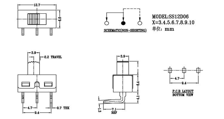 正撥撥動開關主要技術參數 使用功率/額定值:DC 50V 0.3A~1A 觸點電阻:< 100 mΩ 絕緣電阻:≥ 100 MΩ 耐壓:500V AC for 1 minute 撥動力:180~500gf 使用壽命:10000次 操作溫度:-16℃to+60℃ 儲存溫度:-40℃to+85℃ 符合標準:RoHs&Reach