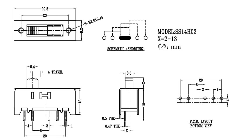 正撥撥動開關主要技術參數 使用功率/額定值:DC 50V 0.3A~1A 觸點電阻:< 100 mΩ 絕緣電阻:≥ 100 MΩ 耐壓:500V AC for 1 minute 撥動力:180~500gf 使用壽命:10000次 操作溫度:-16℃to+60℃ 儲存溫度:-40℃to+85℃ 符合標準:RoHs&Reach