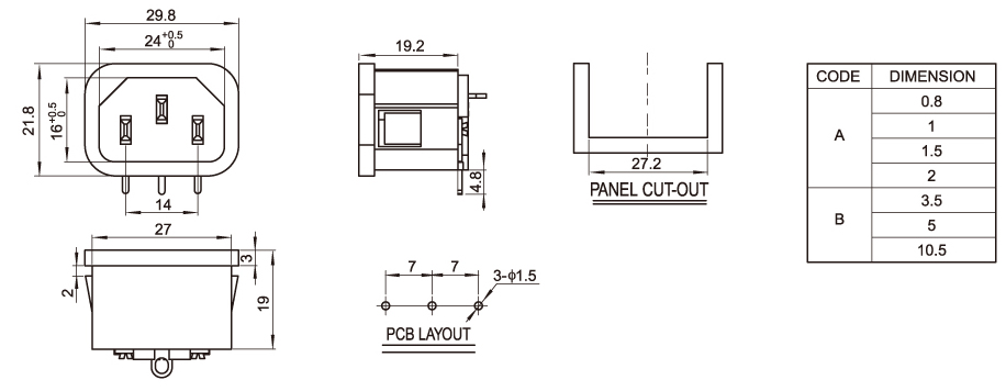 標準:IEC 60320 C14 額定功率:2.5A 250V AC 絕緣電阻:100MΩ 500V DC/1分鐘 絕緣強度:2000V AC/1分鐘 外殼材料:熱塑性塑料 94V-2~V-0
