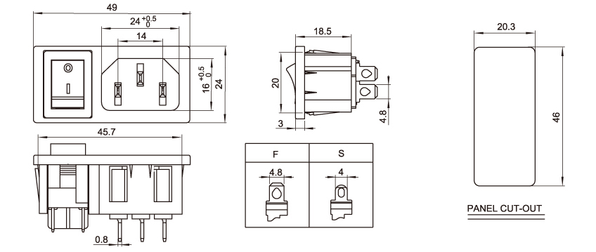 型 號:DB-14-5F+RS: 關健詞:品字尾插座、品字尾電源插座、品字插座、AC電源插座、器具插座 用 途:小家電品字電源;主機機箱插座;電瓶車電源插座;電器插座 尺 寸:49*24 電流電壓:10A 250V