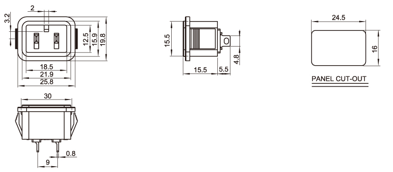 型 號:DB-14-9F1: 關健詞:品字尾插座、品字尾電源插座、品字插座、AC電源插座、器具插座 用 途:小家電品字電源;主機機箱插座;電瓶車電源插座;電器插座 尺 寸:24.5*16 電流電壓:10A 250V