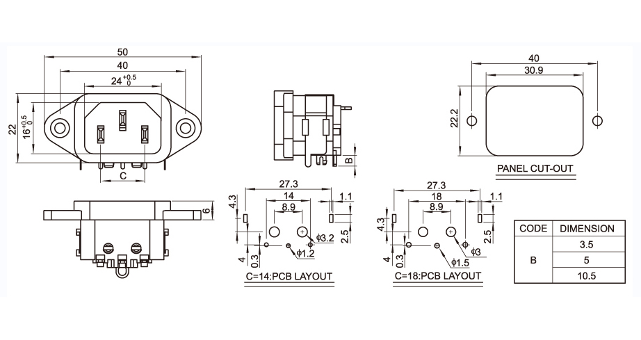 型 號:DB-14-10P-S55(T): 關健詞:品字尾插座、品字尾電源插座、品字插座、AC電源插座、器具插座 用 途:小家電品字電源;主機機箱插座;電瓶車電源插座;電器插座 尺 寸:50*22 電流電壓:10A 250V