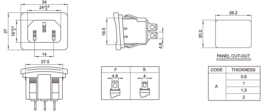 型 號:DB-14-11F: 關健詞:品字尾插座、品字尾電源插座、品字插座、AC電源插座、器具插座 用 途:小家電品字電源;主機機箱插座;電瓶車電源插座;電器插座 尺 寸:34*27 電流電壓:10A 250V
