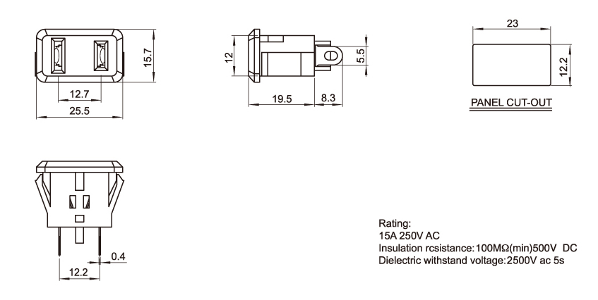型 號:DB-F-M4: 關健詞:美式插座、 美標插座 、美式電源線插座 用途:逆變器插座;電動車電瓶車插座;美標插座;AC電源插座 尺 寸:25.5*15.7 電流電壓:10A 250V