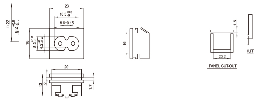型 號:DB-8-21S8: 關健詞:八字插座:八字尾插座;適配器電源插座 用 途:電源適配器:筆記本電源;醫療器械電源;充電器; 尺 寸:23*18 電流電壓:2.5A 250V