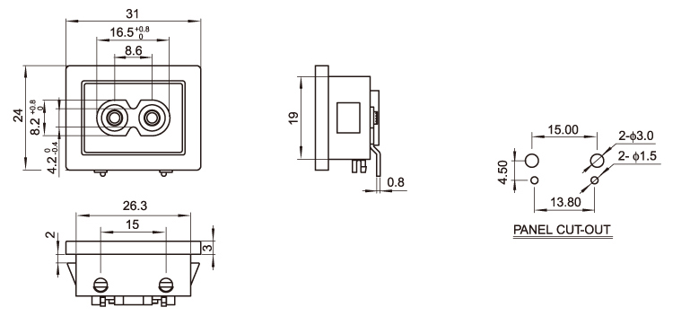 型 號:DB-8-8AP22: 關健詞:八字插座:八字尾插座;適配器電源插座 用 途:電源適配器:筆記本電源;醫療器械電源;充電器; 尺 寸:31*24 電流電壓:2.5A 250V