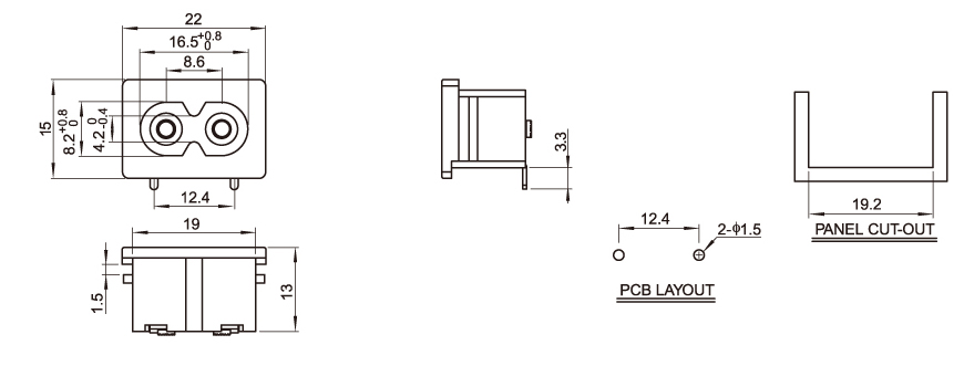 型 號:DB-8-11P23: 關健詞:八字插座:八字尾插座;適配器電源插座 用 途:電源適配器:筆記本電源;醫療器械電源;充電器; 尺 寸:22*15 電流電壓:2.5A 250V