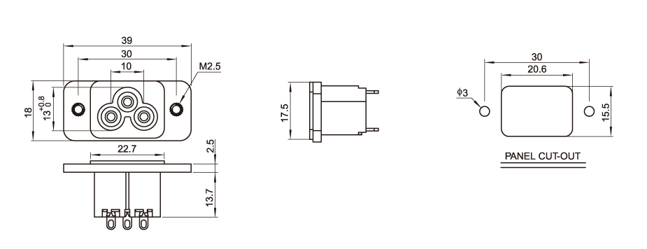 型 號:DB-6-3TS1S1 關健詞:梅花插座:梅花尾插座;適配器電源插座 用 途:電源適配器:筆記本電源;醫療器械電源;充電器; 尺 寸:39*18 電流電壓:10A 250V