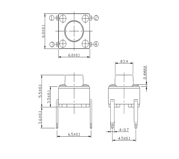 尺寸: 6.0X6.0mm 產品分類: 輕觸開關 - D系列 / 6x6 應用 ※ 各種電子設備像音響設備,辦公設備,通訊設備,測試儀器,電視機,錄像機,汽車等 特點 ※ 可以訂購其它端子形狀 ※ 插腳類型可以直接安在PCB上 ※ 一些輸出腳可以做為引腳讓電路設計更簡單