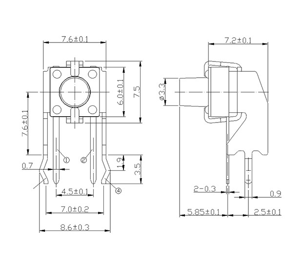 尺寸: 6.0X6.0mm 產品分類: 輕觸開關 - D系列 / 6x6 應用 ※ 各種電子設備像音響設備,辦公設備,通訊設備,測試儀器,電視機,錄像機,汽車等 特點 ※ 插腳類型可以直接安在PCB上 ※ 一些輸出腳可以做為引腳讓電路設計更簡單 ※ 可做防靜電接地腳 ※ 標準的帽子是可以做的