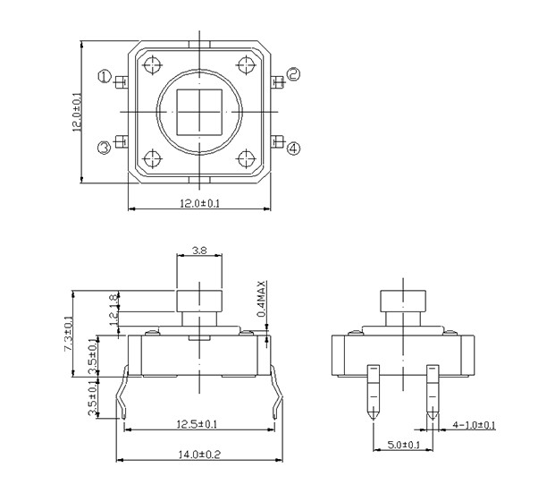 尺寸: 12.0X12.0mm 產品分類: 輕觸開關 - G系列 / 12x12 應用 ※ 各種電子設備像音響設備,辦公設備,通訊設備,測試儀器,電視機,錄像機,汽車等 特點 ※ 插腳類型,可以直接安在PCB上 ※ 一些輸出腳可以做為引腳讓電路設計更簡單 ※ 標準的帽子是可以做的