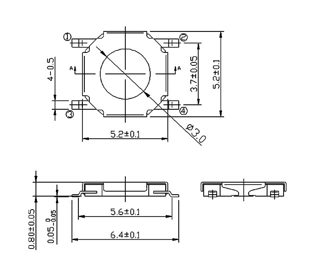 尺寸: 5.2X5.2mm 產品分類: 輕觸開關 - C系列 / 5.2, 4.5, 4.8 應用 ※ 用于操作各種像音響之類的電子設備 ※ 錄像機,通訊設備,相機,汽車等 ※ 家電等 特點 ※ 5.2x5.2尺寸圖,適用于高密度安裝 ※ 0.8mm高的平腳類型,用于薄型設計.帶柄類型追求更簡易的使用. ※ 觸點封裝結構使開關可靠性更高 ※ 回流可焊 ※ 用12mm寬的編帶包裝