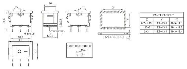 15*21二檔三角 船型開關 蹺板開關 IO電源開關 1.額定工作電壓、電流Rating 3A/6A/15A 250V 2.使用溫度范圍Temperature -25+85℃ 3.接觸電阻Contact Resistance <0.03Ω 4.動作力Actuating Force 1.3+0.5N 5.絕緣電阻Insulation Resistance >100MΩ 6.壽命(switching Life) 10000次