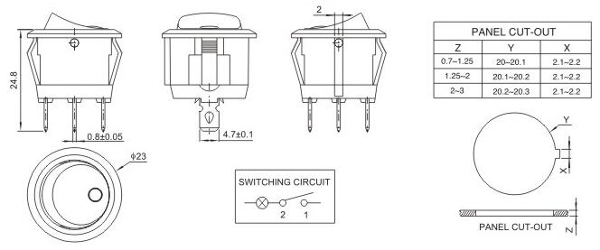 15*21二檔三腳 船型開關 蹺板開關 IO電源開關 1.額定工作電壓、電流Rating 3A/6A/15A 250V 2.使用溫度范圍Temperature -25+85℃ 3.接觸電阻Contact Resistance <0.03Ω 4.動作力Actuating Force 1.3+0.5N 5.絕緣電阻Insulation Resistance >100MΩ 6.壽命(switching Life) 10000次
