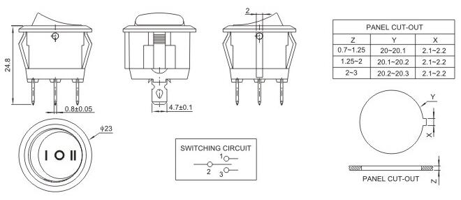 15*21二檔三腳 船型開關 蹺板開關 IO電源開關 1.額定工作電壓、電流Rating 3A/6A/15A 250V 2.使用溫度范圍Temperature -25+85℃ 3.接觸電阻Contact Resistance <0.03Ω 4.動作力Actuating Force 1.3+0.5N 5.絕緣電阻Insulation Resistance >100MΩ 6.壽命(switching Life) 10000次