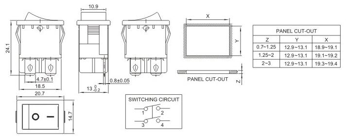 15*21二檔二角 船型開關 蹺板開關 IO電源開關 1.額定工作電壓、電流Rating 3A/6A/15A 250V 2.使用溫度范圍Temperature -25+85℃ 3.接觸電阻Contact Resistance <0.03Ω 4.動作力Actuating Force 1.3+0.5N 5.絕緣電阻Insulation Resistance >100MΩ 6.壽命(switching Life) 10000次