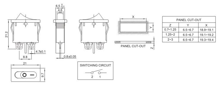 15*21二檔二角 船型開關(guān) 蹺板開關(guān) IO電源開關(guān) 1.額定工作電壓、電流Rating 3A/6A/15A 250V 2.使用溫度范圍Temperature -25+85℃ 3.接觸電阻Contact Resistance <0.03Ω 4.動作力Actuating Force 1.3+0.5N 5.絕緣電阻Insulation Resistance >100MΩ 6.壽命(switching Life) 10000次