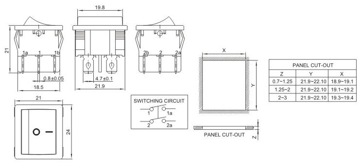 15*21船型開關 蹺板開關 IO電源開關 1.額定工作電壓、電流Rating 3A/6A/15A 250V 2.使用溫度范圍Temperature -25+85℃ 3.接觸電阻Contact Resistance <0.03Ω 4.動作力Actuating Force 1.3+0.5N 5.絕緣電阻Insulation Resistance >100MΩ 6.壽命(switching Life) 10000次